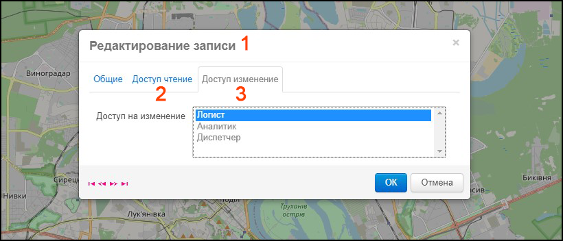 В этой части статьи рассмотрим подробнее использование роли Наблюдатель. Как уже писалось выше - данный тип доступа позволяет пользователю мобильного приложения отслеживать определенные маршруты. Например, у Вас есть отличный клиент, в сеть магазинов которого вы ежедневно доставляете продукцию. Вы можете сделать ему доступ Наблюдатель, и он будет отслеживать перемещение машины, которая выполняет доставку товаров в его точки. Для этого в панели Справочники выберем вкладку Машины 1. В окне Редактирование записи 2 зайдем во вкладку Прочие 3 и в поле Наблюдатель 4 выберем нужного наблюдателя:Теперь пользователь мобильного приложения сможет отслеживать любые маршруты, в которые попадают наблюдаемые им точки.